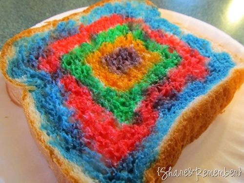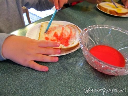 Hemos encontrado esta receta tan divertida y apetecible en el blog Share & Remember. Se trata de dejar que los niños pinten su rebanada de pan libremente. Para ello utilizan pequeñas cantidades de colorantes para alimentos (totalmente comestibles) mezclados con leche. Una receta infantil fácil para una merienda divertida y diferente.