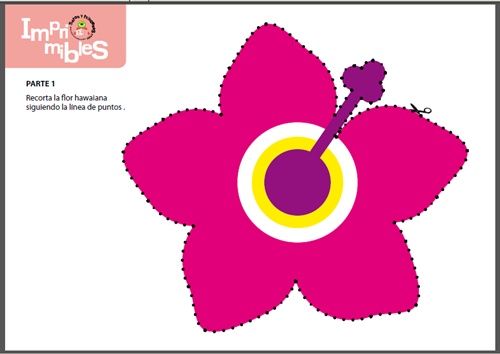 Esta invitación con forma de flor hawaiana se puede imprimir entrando en una web muy interesante, llena de ideas para niños, llamada Sapos y Princesas. Tienes varios modelos para elegir (pez, búho, etc.), y una vez impresas sólo tienes que seguir las instrucciones para doblarlas y escribir el texto en el sitio indicado.