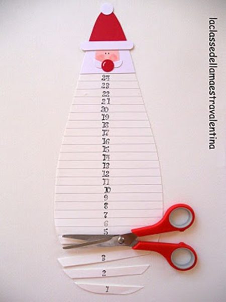El cuerpo en forma de huevo alargado es sencillo de hacer. Sólo tendrás que esmerarte más en la cara de Papá Noel (o el Rey Mago), que tienes que realizar con cartulinas y pinturas. ¡Menuda sorpresa para los peques! Y qué bien se lo pasarán cada día recortando el día que corresponde…