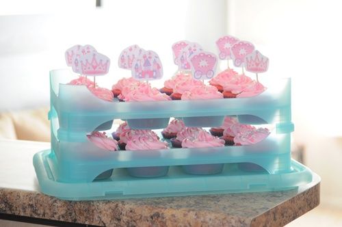 Bonita presentación de la bandeja de cupcakes para una fiesta de princesas.