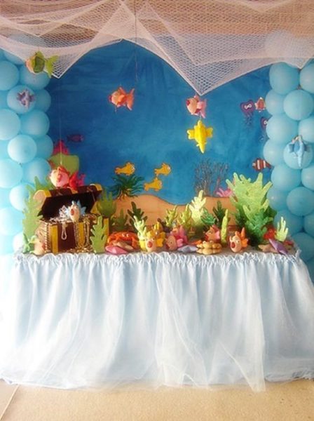 Es ciertamente difícil monar un buffet de dulces igual, pero sí puedes realizar un decorado para una fiesta temática inspirándote en esta fiesta. Por un lado, habrá que recortar siluetas para las algas, la vegetación marina y los corales. Se puede hacer en cartulina, pero siempre quedará mejor en tablex finos y con ayuda de una sierra de calar. Píntalos luego con un rodillo y aplica purpurina. Estrellas, cangrejos y peces para la mesa deberás, o bien hacerlos con la misma técnica, o bien buscarlos en bazares de resina, cerámica, plástico…