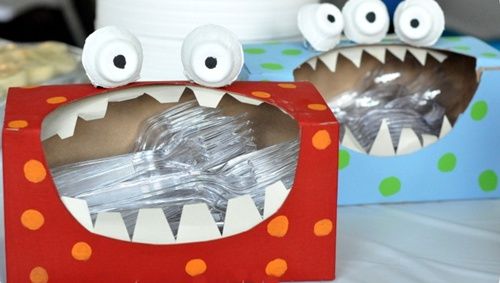 Pues bien, no nos vayamos por las ramas… Estas cajas pueden servir para una fiesta de monstruos simplemente recortándoles esa boca tan monstruosa, y luego haciéndoles una dentadura con una sencilla hoja de papel blanco. Se pintan a continuación las cajas con lunares de colores y finalmente se ‘fabrican’ los ojos a partir de cartones de huevos…