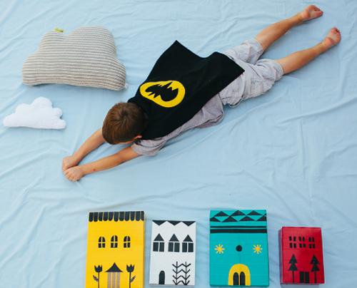 Una sábana azul clarito para el cielo, unas almohadas o corcho blanco en forma de nubes y mientras se busca todo podéis hacer una manualidad con los niños: unas casas dibujadas y pintadas en un cartón o cartulina para que los superhéroes puedan volar encima de ellas. Si ven el resultado les gustará tanto que no querrán bajarse de las nubes!