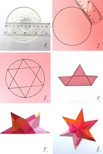 Os hemos traĆdo la plantilla para que os sea mĆ”s fĆ”cil ver como se hacen. Partiendo de una cartulina coged un cĆrculo (o con un compĆ”s) y trazad dentro dos triĆ”ngulos como en el dibujo. Recortad la estrella y dobladla tres veces de tal forma que realicĆ©is tres barquitos distintos yĀ tres figuras como las de la foto 5. Abridla despacio y⦠ Ya esta!!!