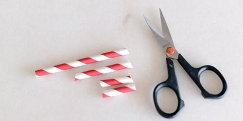 Tenéis que cortar las pajitas en cuatro partes: 1 grande, 1 mediana y 2 pequeñas (como muestra la imagen). Hacer cortes en diagonal, ya que esto hará que la cornamenta os sea más fácil de montar.