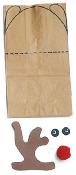 FĆjate cómo dos solapas hacen de orejas y encima sobresale una cartulina recortada con la silueta los cuernos del reno. La nariz es un pompón rojo (los tienes en tiendas de manualidades) y los ojos se pueden hacer con un trozo pequeƱo de cartulina o fieltro negro y blanco.