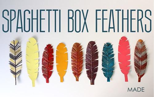 Para confeccionar estas plumas han utilizado el cartón de envase de cereales, así se obtienen plumas más grandes. Podéis utilizar espaguetis de colores pero si lo que queréis es pintarlos no os va a hacer falta, coged los que tengáis en casa o un paquete de los más económicos. La pintura es acrílica de colores metálicos (si no tenéis utilizad la que hay en casa), una tijeras para cortar el cartón, cola y ganas de divertirse.