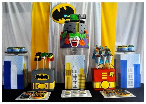 Me encanta el detalle de las cajas forradas con elementos que representan los rascacielos de Gotham City, y que hacen de soporte de los dulces en la mesa de postres. ¡Genial idea, y muy fácil de realizar con cartulinas! Por supuesto que tampoco pasa inadvertida la tarta con ese Joker (perfectamente representado en la película por el histriónico Jack Nicholson…).