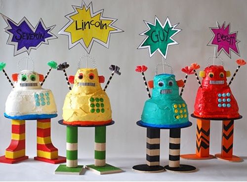 Me parece muy divertida la idea de poner a la tarta una plataforma de madera pintada, que hace de pies y base para el cuerpo del robot. El círculo puede ser un CD envuelto en un film apto para comestibles. Unas velitas, unos muelles, un par de lapiceros a modo de brazos y manos… ¡Verdaderamente, una monada!