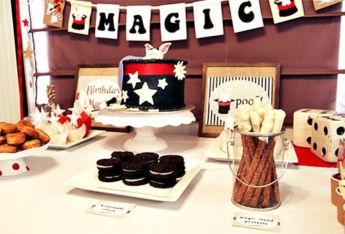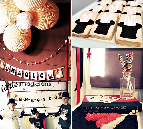 La fiesta de cumpleaños de la magia hace un guiño a todos los tópicos relacionados con los espectáculos de los ilusionistas: los guantes blancos, la capa negra, las varitas mágicas en negro con punta blanca o de metal, las cartas de poker, los dados, y por supuesto la chistera y el largo pañuelo blanco que se transforma en conejo…