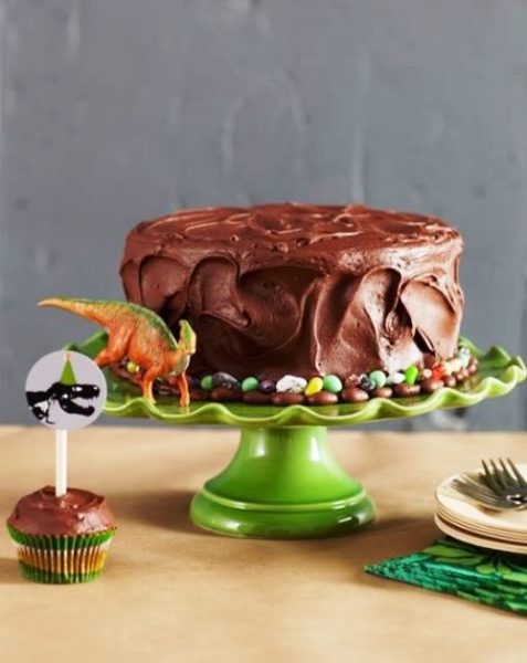 La tarta y el cupcake, con cobertura de chocolate, se adornan con figuras de dinosaurios.