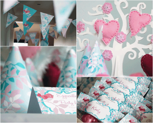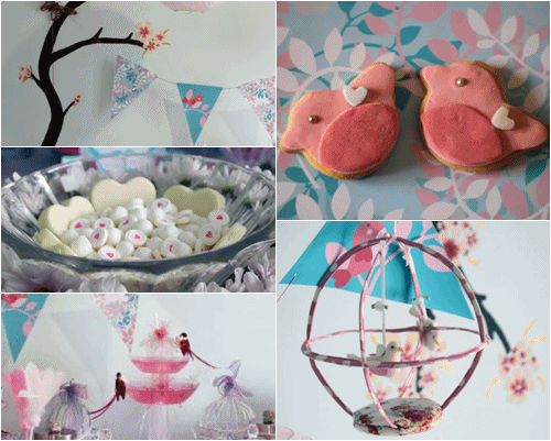 En este caso, incluso se ha pintado una pared con un la rama de un Ć”rbol. No hace falta que llegues al extremo: existen vinilos decorativos adhesivos de este tipo para pegar en la pared. Si no quieres algo permanente y te sientes artista, pinta unas ramas sobre un lienzo grande de los que venden en los bazares o un tablex comprado para la ocasión en un centro de bricolaje. Pinta el fondo a rodillo con pintura plĆ”stica de un tono Ā apastelado y luego traza la rama de Ć”rbol. No serĆ” de un solo uso: te servirĆ” de decorado para muchas nuevas fiestas simplemente aplicando un nuevo fondo de pintura… Si no se te dan las Bellas Artes, ni lo intentes. Mejor piensa en imprimir diseƱos que encuentres en Internet…