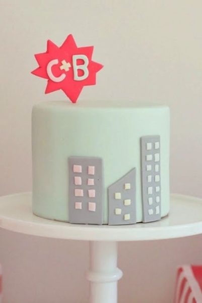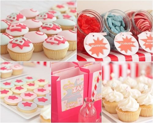 Por eso se han elegido como colores el rosa chicle y azul celeste, y en muchas imágenes, en lugar de ver las caras de los héroes más populares entre nuestros peques, vemos sutiles alusiones a los cómics de superhéroes: fíjate que la letra elegida para rotular carteles, guirnalda y demás es la típica del diseño gráfico de los cómics de Batman, Spiderman, etc. Las estrellas que adornan aquí y allá simulan éxitos, pero también golpes, peleas, etc.