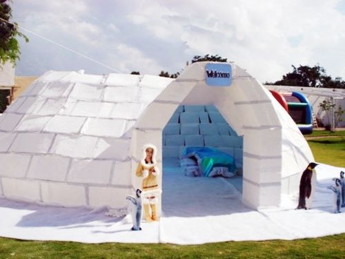 No sé los materiales utilizados para construir el igloo ni la forma de hacerlo (en algunas pistas de esquí enseñan a construirlos de verdad como actividad lúdica…), pero la idea es excelente. Sugiero a las mamás que se sientan atraidas por esta fiesta al aire libre que prueben con una tienda de campaña tipo igloo grande que luego pueden envolver con algún tipo de papel o plástico con el dibujo de los bloques de hielo…