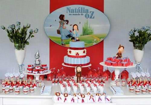 En este caso, la inspiración viene de Brasil, y la publica Ana Carol en su blog Memoria en folha de Scrap. La fiesta se ha personalizado para Natalia, la protagonista del cumpleaños. Es preciosa la combinación de colores que se ha logrado entre el azul celeste del pichi que Judy Garland lucía en el clásico del cine y el rojo de sus zapatos de fantasía.