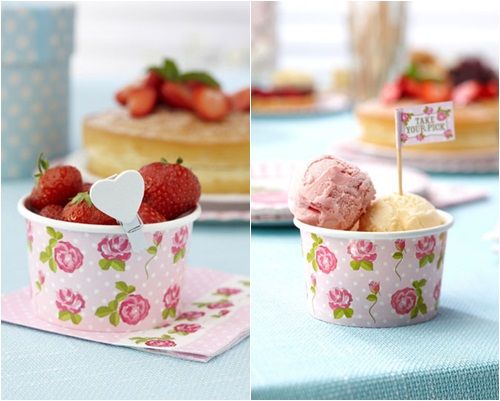 Fíjate en la sutileza de todos los detalles de esta fiesta infantil, vista en Hola Mamá… Los colores celeste y rosa enmarcan la decoración de la mesa. Y observa qué bonitos platos y vasitos de helados con flores vintage. Antes sólo era posible encontrar estos productos en tiendas inglesas. Hoy, cada vez es más fácil encontrar menaje de mesa así de bonito en las tiendas online de artículos de fiesta. Te recomiendo que eches un vistazo a todas las que ves en los banners de la derecha, porque cada poco traen novedades que te sorprenderán…