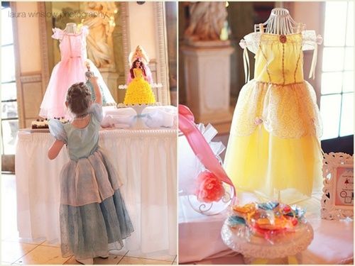 Los recursos utilizados para esta fiesta son realmente espectaculares, pero a menudo los tenemos en casa y no los utilizamos… Me encanta la idea de colocar antiguos figurines con disfraces de princesa para decorar las mesas, pero fíjate también en las muñecas (seguro que tienes algunas en casa como yo) y las cookies de vestidos de fiesta (si no recuerdo mal, el rosa de Bella Durmiente, el amarillo de la Bella y la Bestia y el azul de Cenicienta…).