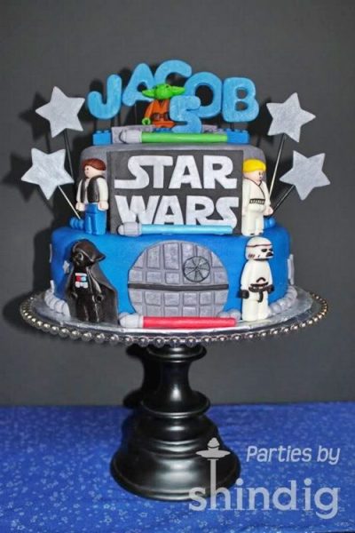 Cuenta Amanda que su hijo Jacob se empeñó en hacer una fiesta sobre la famosa saga del espacio. Así es que, como no había forma de convencerle de que podía elegir otro tema ‘más fácil’, esta mamá se puso manos a la obra: primero eligió los colores (azul, negro, plata…) y después se puso a buscar imágenes de la película La Guerra de las Galaxias como inspiración. Los muñecos que decoran la tarta son de esos articulados tipo Playmobil que tienen todos los niños. Fijáos que divertidos los refrescos, con el nombre de Yoda Soda… ¡Y qué simple etiquetarlos con un 5!