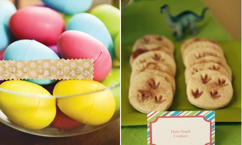Las galletas de dinos, los globos y la mesa todo forma parte de la decoración.
