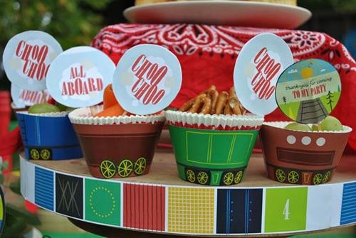 Si a vuestro peque le gustan los trenes, digo yo, que mejor regalo que prepararle una fiesta sorpresa donde su regalo ya esté bien montado en la mesa. Pues eso, vías y trenes combinados con los cupcakes y un buen pastel, seguro que le encantará.