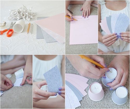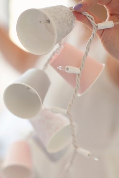 Para elaborar este proyecto se han utilizado diferentes papeles mate, con los que han forrado los vasos desechables: los sutiles estampados de florecitas se mezclan con dos tonalidades pastel, rosa claro y malva. Se han elegido colores muy claros para permitir el paso de la luz. (A este respecto, atención con los colores oscuros y mezclados, no parezca una guirnalda de feria…).