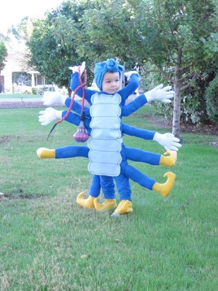 Hasta el chiquitín se disfrazó de lindo gatito… Menudo humor esta familia: debió de empezar a coser disfraces el pasado verano, aunque lo cierto es que ha merecido la pena… Si te animas, observa que el de ciempiés se hace a partir de varios pijamas azules y el de conejo es ciertamente sencillo, ya que sólo hay que plantearse hacer las orejas de peluche a partir de una diadema, el reloj de cartulina y la enorme pajarita roja para la camisa.