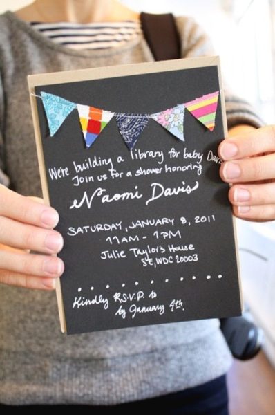 Pues bien, esta invitación es sencilla de hacer sobre una cartulina negra con un lápiz de color blanco, o mejor aún, sobre tablillas imitando pizarras: aplica un fondo negro con pintura acrílica y escribe encima con pincel fino y pintura blanca. ¡La idea de las banderitas es genial y no puedes obviarla, aunque no te emocionen las manualidades! Cose pequeños triangulitos de diferentes telas vintage a máquina, y luego pega sólo el borde superior sobre la invitación… ¡Sorprenderás!