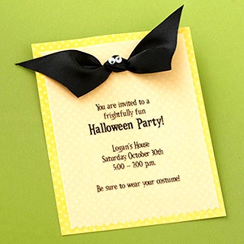 Esta invitación para una fiesta Halloween es sensacional. Fíjate que está hecha sobre un estampado de los que se encuentran por miles en internet (busca por ‘printable patterned paper‘). Luego va decorada con un sencillo lazo de terciopelo negro, que se ajusta a través de dos agujeros en la cartulina. Precisamente la gracia es que la lazada forma las alas de un murciélago y sólo necesitas pegarle un par de ojos adhesivos…