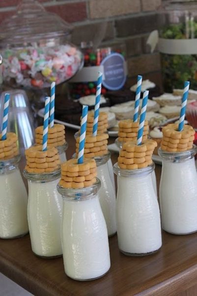 ¿Qué tal la leche en botellines como los que antes traía el lechero a casa? Prepárala bien fría (mejor de la que venden fresca en la zona refrigerada del super) con una pajita vintage y unas galletas ensartadas en ella… Las galletas Rio de toda la vida ya vienen con agujero, y te facilitarán mucho la tarea… ¡No sea que acabes haciendo sopas de leche porque se te han roto todas las galletas…!