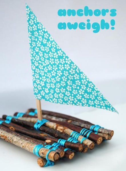 Una vez en casa coged una cuerda, un palo para hacer el mástil (os sirve el de un helado) y un trozo de papel o tela para la vela. Fijaros bien como atan los troncos con la cuerda. Necesitaréis un poco de paciencia si no lo habéis hecho nunca, pero es fácil. Si todo funciona bien la balsa de troncos tiene que flotar en el agua. Podéis probarla en la bañera, si funciona, organizáis otra excursión para que navegue por un riachuelo. Suerte!