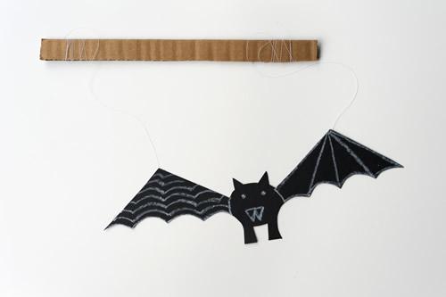 Es una manualidad para niños muy sencillas de hacer además os hemos dejado el PDF aquí con una plantilla para que podáis tomarla como ejemplo. Solo necesitáis cartulina negra, cinta adhesiva para sujetar el hilo, hilo de pescar (si no tenéis, sirve cualquier otro que tengáis en casa) y un trozo de cartón para hacerlo servir de mango. Con un lápiz de cera de color blanco podéis hacer el dibujo, recortar y… murciélago a volar!