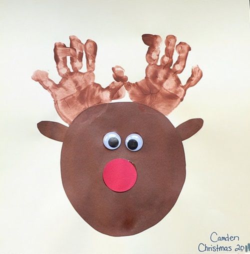 ¿Te has fijado en que los cuernos del Reno Rudolph son las huellas de las palmas de las manos? ”Me parece una idea estupenda! El resto de este proyecto de manualidades de Navidad con pintura de manos es fÔcil y lo puedes hacer con niños: hay que recortar cartulinas con las diferentes formas que ves en el dibujo e ir pegÔndolas con barra de pegamento corriente.