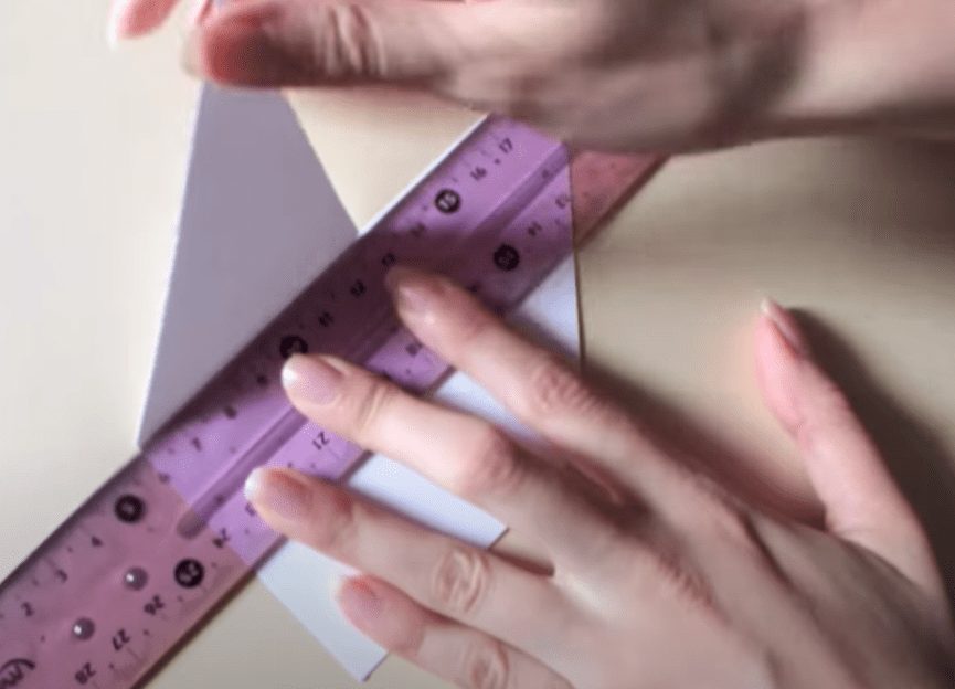 Ahora vamos a hacer los dobleces marcamos bien el doblez y nos ayudamos con la regla para doblarlo y hacemos lo mismo en este otro lado una vez que tenemos esto, vamos a poner pegamento en este triƔngulo doblamos este hacia adentro y encima pegamos este otro.