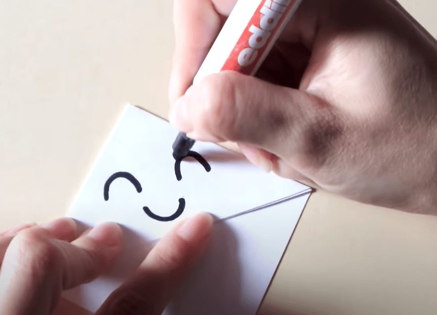 Dibujamos los ojos, la nariz, y la boca. Le voy a pegar los coloretes y unas orejitas.