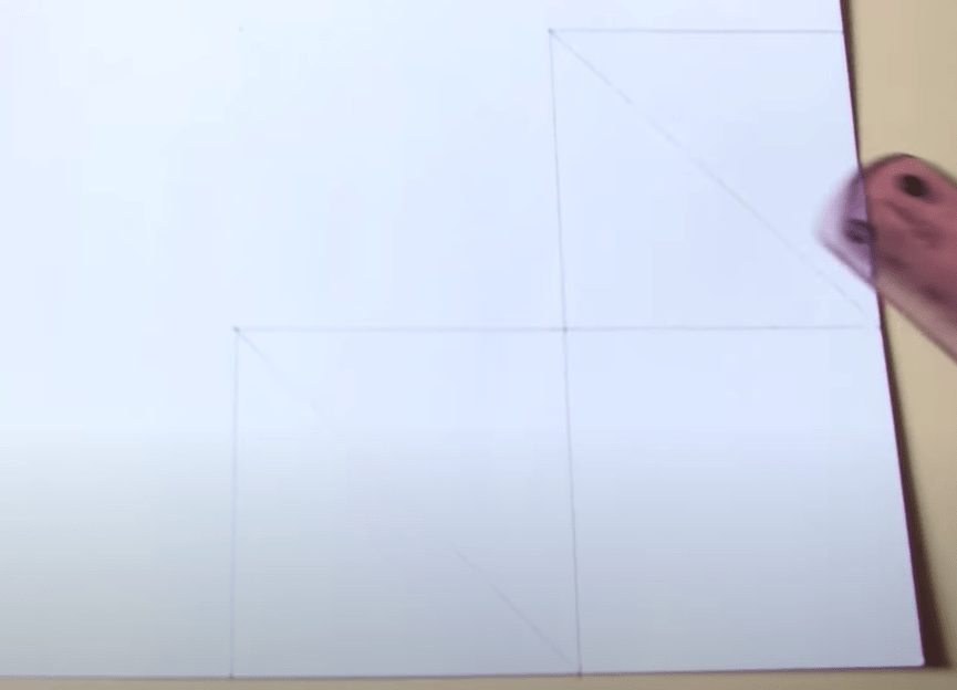 Tenemos que tener tres cuadrados vamos a dividir este cuadrado por la mitad haciendo una lĆnea diagonal y hacemos lo mismo en este otro cuadrado.