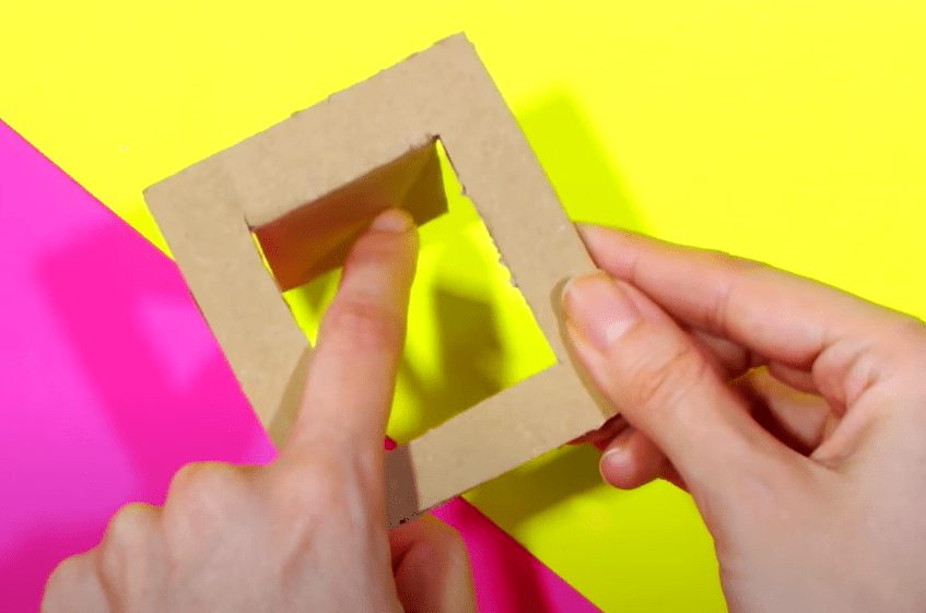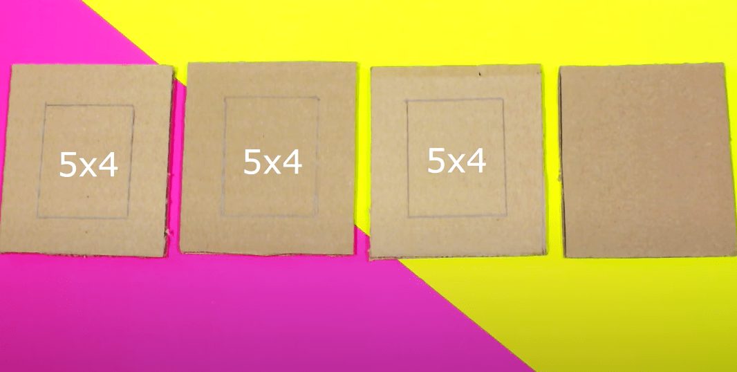 Necesitamos cuatro piezas de cartón de 8 x 7 centĆmetros a estas tres piezas les hacemos en el centro un rectĆ”ngulo, de 5 x 4 centĆmetros ya estĆ” un rectĆ”ngulo de 65 x 45 centĆmetros con un cĆŗter, cortamos por la mitad y por el lado, que queda doblado y las otras tres piezas las cortamos tal y como se ve en las imĆ”genes.