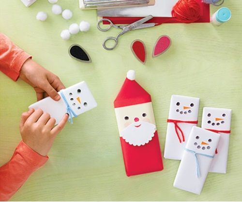 Decorar las tabletas de chocolate puede convertirse en una manualidad fácil para hacer con niños en Navidad! Sólo hay que envolverlas en papel blanco y luego pintar la cara con pinturas tipo témpera. Finalmente, se envuelven en papel de seda rojo, se fabrica la gorra y con una bolita de algodón se pone la borla. ¡Voilà, figuritas de Papa Noel de chocolate listas para comer!