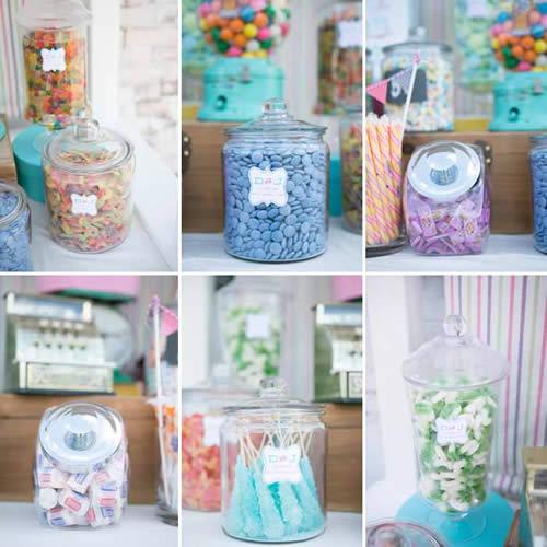 Diferentes botes, todos de cristal, para las distintas chuches y caramelos. Hay de todos los colores y para todos los gustos.