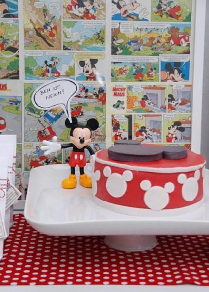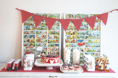 Hoy os traemos una fiesta temática de un Mickey no tan infantil, basada sobre todo en los estupendos detalles y en los papeles de cómics del personaje, que visten la fiesta de rojo y negro. La idea la hemos encontrado en Bebé con estilo.