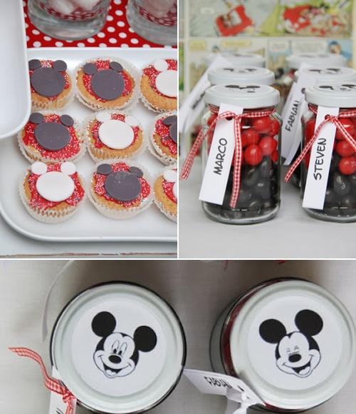 Todos los detalles nos llevan a la silueta de Mickey, fijaros en los botes de caramelos para obsequiar a los invitados: rojo, negro para los caramelos y el dibujo de distintas caras del simpático ratón en cada tapa.