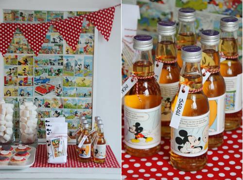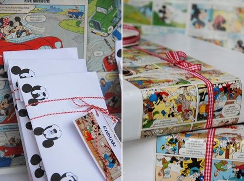 Las invitaciones y el papel de envolver los regalos llevan tiras de comic, sin duda una forma original de presentarlos. Nos ha gustado esta nueva versión de una fiesta con Mickey.
