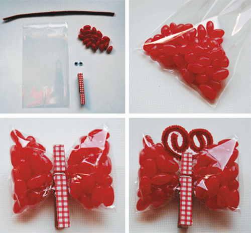Me parece una genialidad y ademĆ”s es superfĆ”cil de realizar… Se trata de hacer tĆŗ mismo pequeƱos paquetes de caramelos en bolsitas de plĆ”stico transparentes, y luego formar con ellos una mariposa. Sólo necesitas una pinza de ropa (a poder ser decorada) y limpiadores de pipa (los encuentras en estancos y tiendas de manualidades). Es una idea muy divertida encontrada en Baballa.