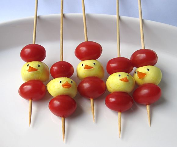 Vamos poniendo el tomate cherry y las bolitas de mozzarella en los palitos de pincho. Con semillas de sésamo hacemos los ojos de los pollitos y con un poco de zanahoria cruda el pico.