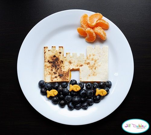 Los platos creativos para niños son una excelente forma de hacer que las comidas sean más divertidas para ellos. El plato con el castillo medieval (parece una crepe rellena) es una excelente excusa para que se coman la fruta que lo acompaña (las uvas del foso y los gajos de mandarina que representan el sol). Estos los ha hecho Jill de Meet the Dubiens, un blog con creaciones realmente originales.