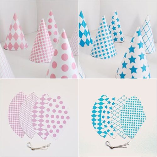 Pues bien, hemos encontrado unos sombreros de cono con unos estampados deliciosos, y muy clásicos, en azul para los niños y rosa para las niñas. Estos los venden en packs de 10 en My Little Day, y cuestan 9,50€. Te los envían desmontados para que tú los compongas y les pongas la gomita justo unas horas antes de la celebración. ¡Perfectos!