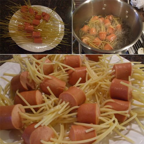 3-     Una vez hemos puesto los espaguetis en las salchichas, hemos de calcular a ojo la ración, lo ponemos a hervir unos diez minutos mÔs o menos.