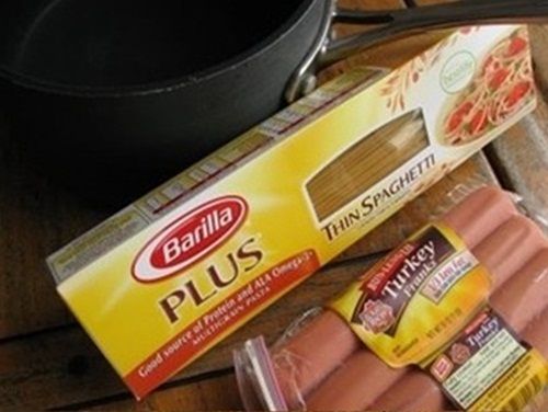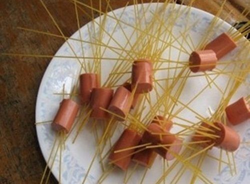Tienen una pinta buenĆsima, y la verdad es que es una excelente idea pinchar la pasta seca en los trozos de salchicha de tipo alemĆ”n para que le salgan esos bucles una vez que lo cueces todo…