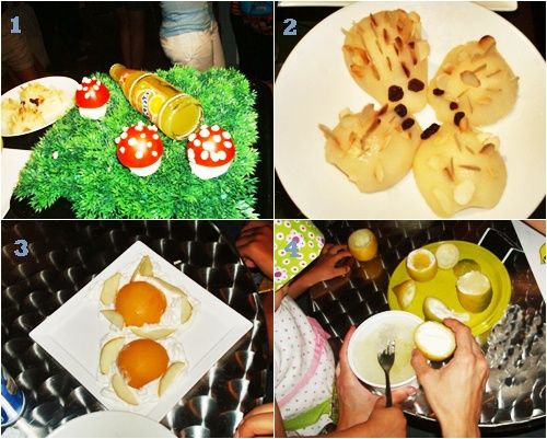 - Los erizos, que en realidad son una receta de peras en almíbar, láminas de frutos secos y pasas, también causaron sensación y los peques se entretuvieron poniendo los pinchos al erizo. (Ojo con esta receta, no apta para alérgicos a los frutos secos, que son multitud…).