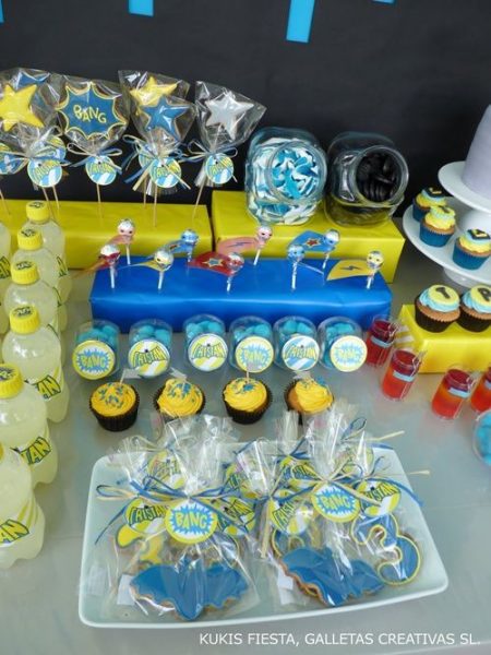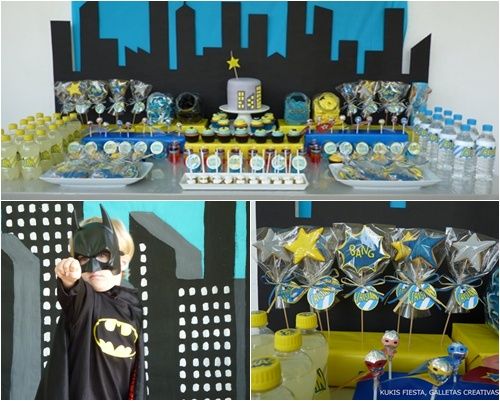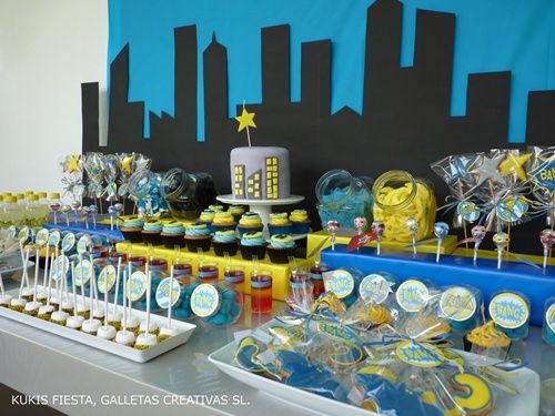 Incluso esa tarta Gotham City la preparó esta mamá tan creativa. Fijáos en el decorado de rascacielos que hay tras la mesa de postres… No me negaréis que es fantástico, un extraordinario homenaje al mundo del cómic. No sé qué materiales utilizó aquí la madre de Tristán, pero las láminas de foam o goma-eva dan un excelente resultado para este tipo de trabajos manuales.