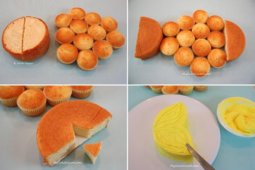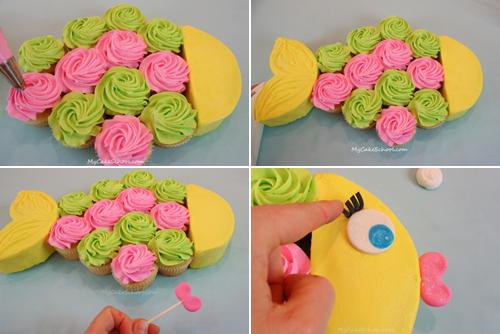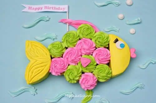 Simpática tarta en forma de pez para una tarta de cumpleaños. Además veréis que es muy sencilla de hacer, casi como montar un rompecabezas a base de magdalenas (que se convierten en apetecibles cupcakes). Lo hemos encontrado en My cakes chool, lo han hecho en tonos pastel rosa y amarillo, pero con la cantidad de colorantes que podéis encontrar podéis encontrar en el mercado lo coloreáis como más os guste.